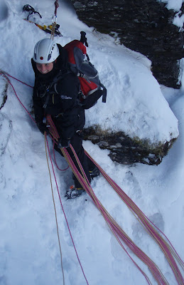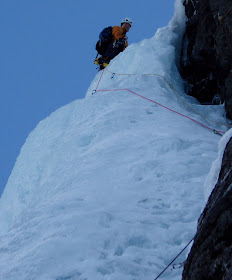 We went to Beinn Udlaidh to see how the ice was shaping up. Lots of other people had the same idea. There were about 12 cars at the car park. By the time we got to the climbs we were the second team on Quartzvein Scoop, with other teams lining up behind. Although the climb is short (90m) it's worth it's 3 stars. At the moment the main pitch is a short vertical fall. After this week I'm definitely a leashless convert..