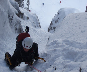 Lena arriving at the belay after the first ice fall. Another team climbs in below to start the gully