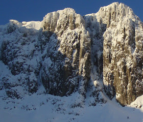 We parked and saw a team with headtorches high above us on the path (but no car in the car park?). We walked quickly and by the time we arrived in the basin the team had set up below SC Gully. But they were 40 mins ahead of us - so we continued on our plan to climb the gully. The route was in awesome condition. The ice was a bit chopped out by so many previous ascents, but still deep enough for screws.